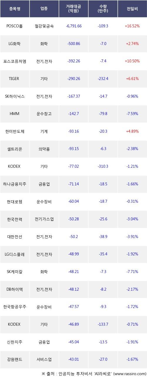 외국인 투자자의 순매도 상위 20개 종목은 POSCO홀딩스, LG화학, 포스코퓨처엠, TIGER 2차전지소재Fn, SK하이닉스, HMM, 한미반도체, 셀트리온, KODEX 200선물인버스2X, 하나금융지주등이다.