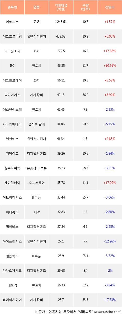 외국인 투자자의 순매수 상위 20개 종목은 에코프로, 에코프로비엠, 나노신소재, ISC, 에코프로에이치엔, 씨아이에스, 에스앤에스텍, 카나리아바이오, 엘앤에프, 위메이드등이다.