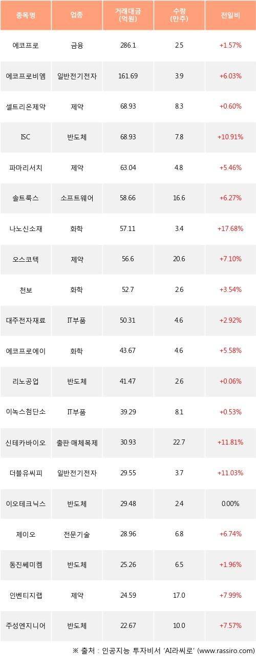 기관 투자자의 순매수 상위 20개 종목은 에코프로, 에코프로비엠, 셀트리온제약, ISC, 파마리서치, 솔트룩스, 나노신소재, 오스코텍, 천보, 대주전자재료등이다.