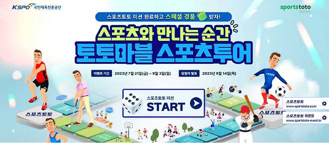 [이데일리 이윤정 기자] 국민체육진흥공단이 발행하는 체육진흥투표권 스포츠토토의 공식 인터넷 발매사이트 베트맨은 ‘스포츠와 만나는 순간, 토토마블 스포츠투어’ 이벤트를 오는 9월 3일까지 진행한다고 25일 밝혔다.