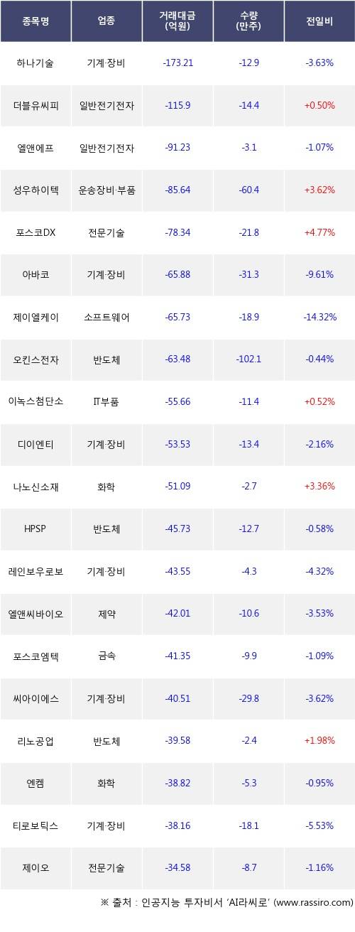 외국인 투자자의 순매도 상위 20개 종목은 하나기술, 더블유씨피, 엘앤에프, 성우하이텍, 포스코DX, 아바코, 제이엘케이, 오킨스전자, 이녹스첨단소재, 디이엔티등이다.
