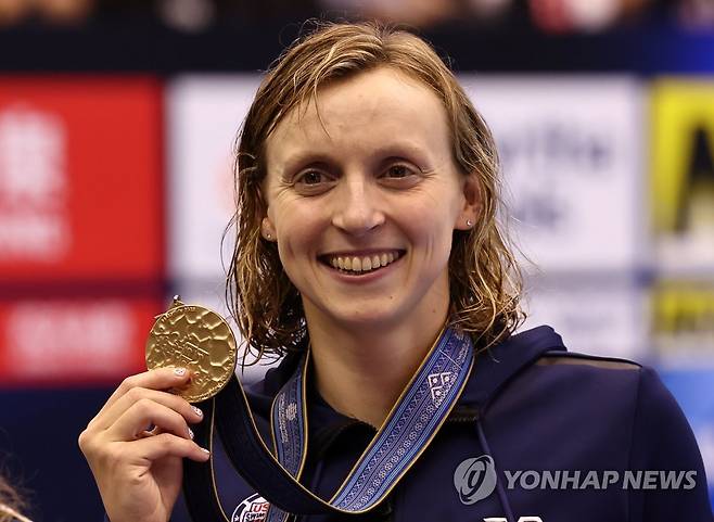 (후쿠오카=연합뉴스) 윤동진 기자 = 금메달을 획득한 미국 케이티 러데키가 25일 일본 후쿠오카 마린 메세 후쿠오카홀에서 열린 2023세계수영선수권 여자 1500m 자유형 메달 세리머니에서 메달을 들어 보이고 있다. 2023.7.25