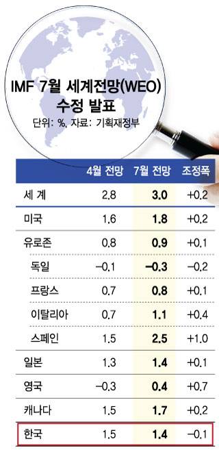 IMF는 25일(현지시간) 발표한 '세계경제전망(WEO) 수정'에서 우리나라의 올해 성장률 전망치를 1.4%로 제시했다. 4월 전망치(1.5%) 대비 0.1%p 하향조정했다. 내년 경제성장률 전망치는 종전과 같은 2.4%로 유지했다.