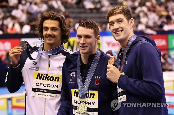 (후쿠오카=연합뉴스) 윤동진 기자 = 금메달을 차지한 미국 라이언 머피(가운데)가 25일 일본 후쿠오카 마린 메세 후쿠오카홀에서 열린 2023세계수영선수권 남자 100m 평영 메달 세리머니에서 기념촬영을 하고 있다. 2023.7.25