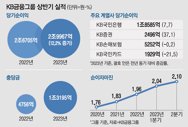 KB금융지주 관계자는 “올 상반기 1조 3000억원이 넘는 대손충당금을 선제적으로 쌓았지만 순이자이익 확대와 견조한 비은행 이익이 실적을 견인해 시장의 기대를 큰 폭으로 웃도는 실적을 올렸다”고 말했다.