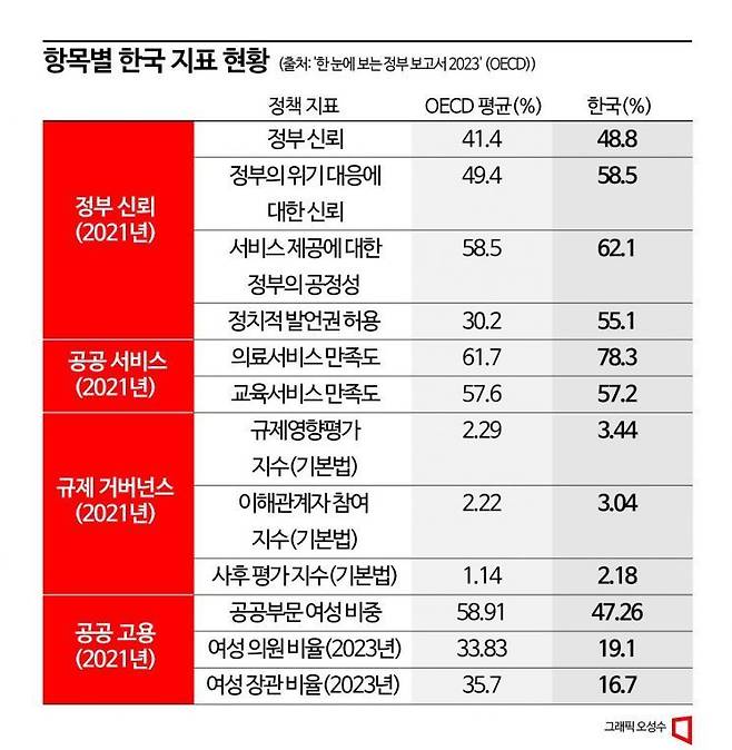 한국 정부에 대한 국민의 신뢰도가 경제협력개발기구(OECD) 국가 평균치를 상회하는 것으로 나타났다. 공공서비스에 대한 만족도도 높게 나타났다. 특히 우리나라 국민들의 의료서비스에 대한 만족도는 조사대상국 가운데 3번째로 높았다.