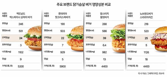 영양성분 기준치상 포화지방 하루 섭취권장량은 15g인데 이와 비교했을 때도 닭가슴살 버거는 기존 패티에 비해 부담이 적어요. 포화지방을 기준으로 보면 ▷맥도날드 맥스파이시 상하이버거(3g) ▷노브랜드 스리라차 치킨(5g) ▷맘스터치 휠렛버거(6.4g) ▷롯데리아 핫크리스피버거(7g) 순으로 적었습니다. 빅맥은 포화지방이 11g(권장량 73%)인 반면 맥스파이시 상하이버거는 3g(권장량 20%)으로 4분의 1이나 적은 게 대표적이죠.