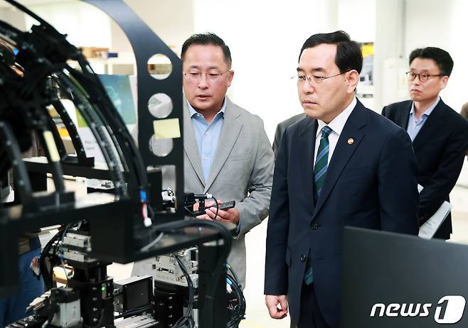 (서울=뉴스1) = 이창양 산업통상자원부 장관이 26일 경기도 성남시 성남일반산업단지에 입주한 퓨런티어 본사를 방문, 개발연구실 등을 둘러보고 있다. (산업통상자원부 제공) 2023.7.26/뉴스1
