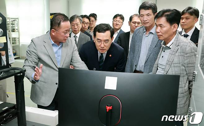 (서울=뉴스1) = 이창양 산업통상자원부 장관이 26일 경기도 성남시 성남일반산업단지에 입주한 퓨런티어 본사를 방문, 개발연구실 등을 둘러보고 있다. (산업통상자원부 제공) 2023.7.26/뉴스1