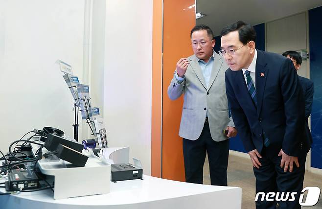 (서울=뉴스1) = 이창양 산업통상자원부 장관이 26일 경기도 성남시 성남일반산업단지에 입주한 퓨런티어 본사를 방문, 개발연구실 등을 둘러보고 있다. (산업통상자원부 제공) 2023.7.26/뉴스1