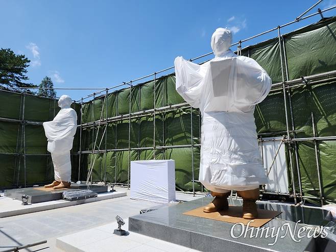 | ▲ 경북 칠곡군 다부동전적기념관에 세워진 이승만·트루먼 동상. 오는 27일 예정인 제막식을 앞두고 천으로 덮어놓았다. |