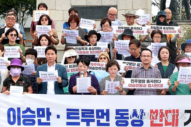 | ▲ 부마민주항쟁기념사업회, 열린사회희망연대를 비롯한 단체들은 지난 25일 창원마산 3.15의거기념탑 앞에서 기자회견을 열어 "이승만-트루먼 동상 반대"를 외쳤다. |