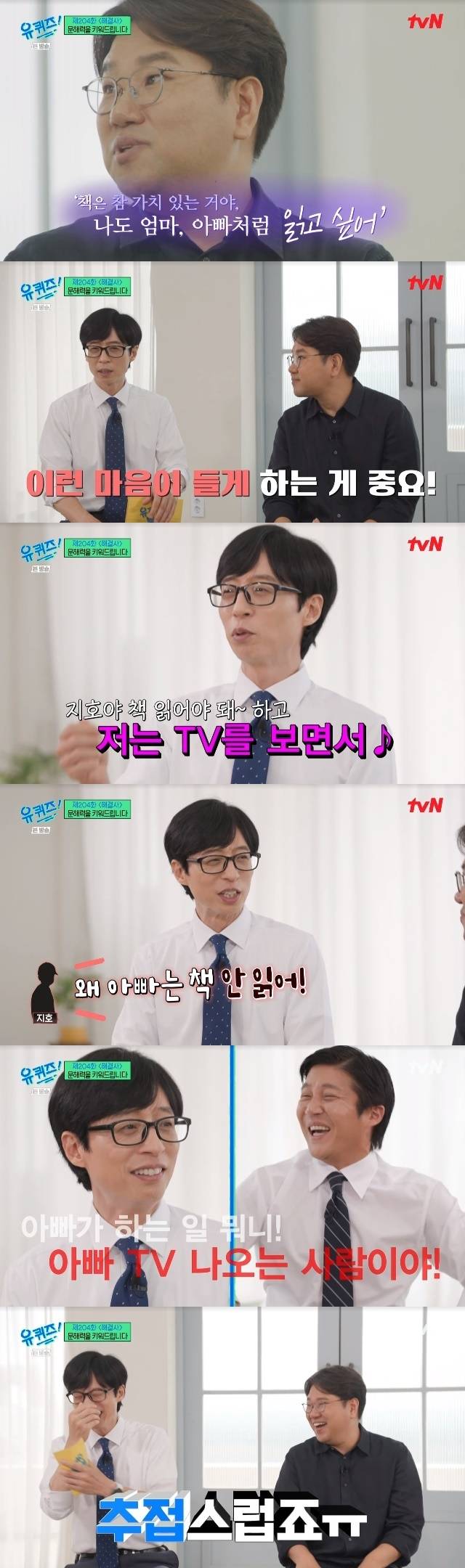 유재석은 "주변에 책 좋아하는 아이들은 부모님이 그런 모습을 많이 보여주시더라"면서 "책 많이 읽으시냐. 집에 TV 없으시지 않냐"고 조병영 교수의 가정 분위기를 물었다.