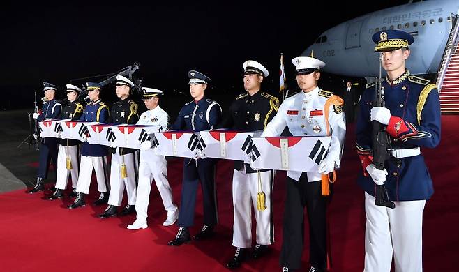 | 국군 전사자 유해 7위 고국 품으로 26일 경기 성남 서울공항에서 열린 국군 전사자 유해 봉환식에서 국군의장대가 전사자 유해 7위를 공군 다목적 공중급유 수송기 ‘시그너스’에서 내리고 있다. 성남=대통령실사진기자단 |