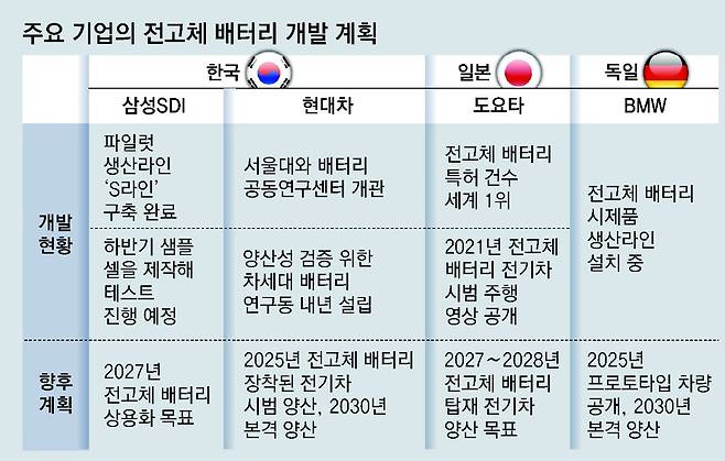 리튬이온전지 분야에선 존재감이 없는 독일 자동차 업계도 전고체 배터리 기술에선 뒤지지 않겠다며 속도를 내고 있다. BMW그룹은 미국 솔리드파워와 손잡고 독일에 전고체 배터리 시제품 생산 라인을 설치 중이다. 2025년 프로토타입 차량을 공개하고 2030년 양산에 들어갈 예정이다.