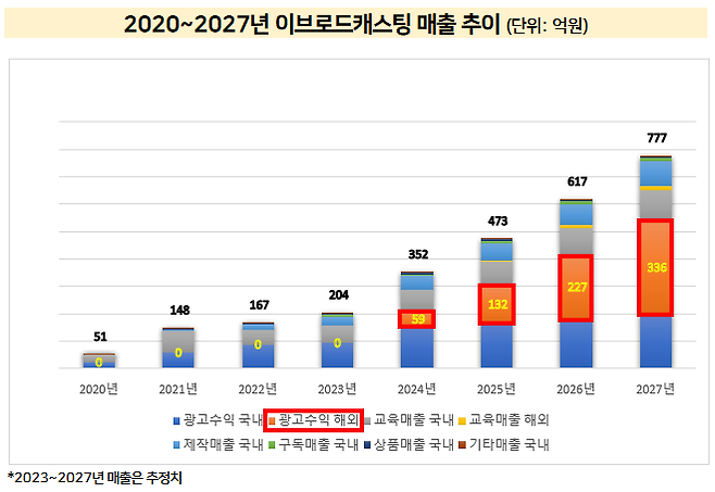 이 회사는 2027년까지 해외 구독자 수가 3700만명으로 늘어나 같은 해 해외에서만 광고 매출 336억원을 거둘 것으로 추정했다. 2027년 전체 추정 매출(777억원)의 43%에 달하는 비중이다.