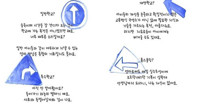 이어 한수자는 일반 학교 수업 중 집중을 못하는 아이를 그리며 교육에 대한 고민을 전했다. 그는 일반학교는 아이들과 같이 어울릴 얼마 안남은 통합의 기회로, 특수학교는 들어가기 힘들며 사회와 동떨어질까 겁이 난다고 밝혔다.