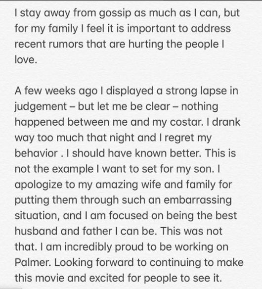 더불어 "나는 그날 밤 술을 너무 많이 마셨고 내 행동을 후회한다. 이건 내가 우리 아들에게 보여주고 싶었던 모습이 아니었다. 아내와 가족을 이런 당황스러운 상황과 마주하게 만들어 너무 미안하다"라고 반성했다. "할 수 있는 한 최고의 남편과 아빠가 되고 싶었데 이건 아니었다"라고 덧붙였다.