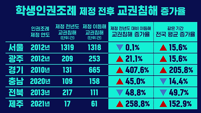 광주와 경기도, 충청남도, 제주도는 학생인권조례 제정 전년도 대비 제정 이듬해 교권 침해 증가율이 전국보다 높았습니다. 반면, 교권 침해 사례가 가장 많았던 서울의 경우 0.1% 하락했지만, 같은 기간 전국은 15.6% 증가했습니다. 전라북도는 전국과 비교하면 거의 차이가 없었습니다.