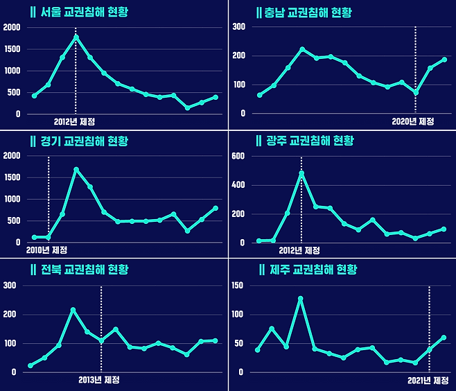 서울은 2012년 제정 당시 교권 침해 사례가 가장 높았는데, 이후 조금씩 감소하는 추세입니다. 반면, 경기도는 2010년 제정 이후 폭증한 걸로 나왔습니다. 광주는 2012년 제정 이후 감소, 충청남도는 2020년 제정 이후 증가 추세였습니다. 지역 별로 학생인권조례의 영향을 일반화하기 어렵습니다.