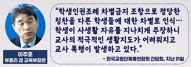 포문은 이주호 부총리 겸 교육부 장관이 열었습니다. 이 부총리는 지난 21일 서울 서초구 한국교원단체총연합회에서 열린 '교권 확립을 위한 현장 간담회'에서 "학생의 인권이 지나치게 강조되고 우선시되면서 교실 현장이 붕괴되고 있다"고 말했습니다. 그러면서 그 사례로 학생인권조례의 차별 금지 조항을 지목했습니다.
