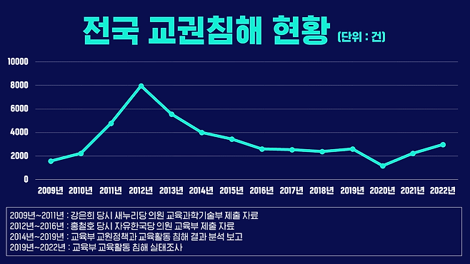 먼저, 사실은팀이 정리한 연도별 전국 교권 침해 현황입니다. 2009년부터 데이터 분석이 가능했습니다.