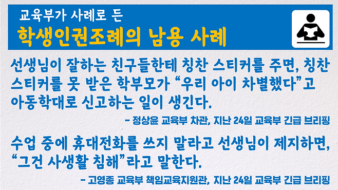 학생인권조례가 차별받지 않을 권리, 사생활의 자유를 규정하고 있는데, 학교 현장에서 이를 남용하는 사례가 생기고 있다는 겁니다.