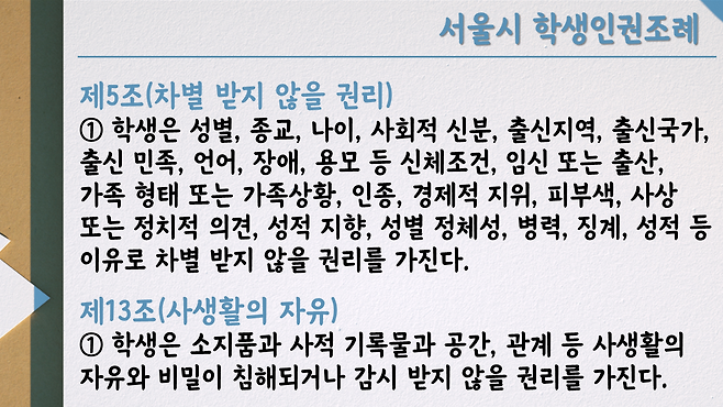 더군다나 서울시 학생인권조례에는 다음과 같은 규정도 있습니다.