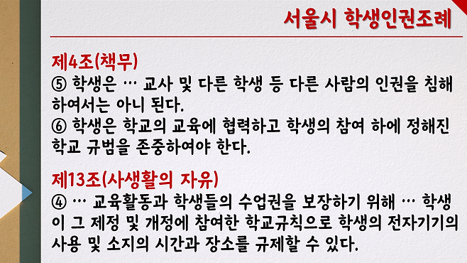 학생인권조례에는 교사를 비롯해 타인의 인권을 훼손하면 안 된다는 책무, 학교 규범 준수 의무, 휴대전화 사용 제한 절차와 같은 규정도 동시에 존재하고 있습니다. 그렇다면, 학생인권조례의 특정 문구를 있는 그대로 볼 게 아니라, 여러 조항들의 의미를 종합적으로 바라봐야 한다는 것을 아이들과 학부모에게 명확히 알릴 필요가 있습니다.