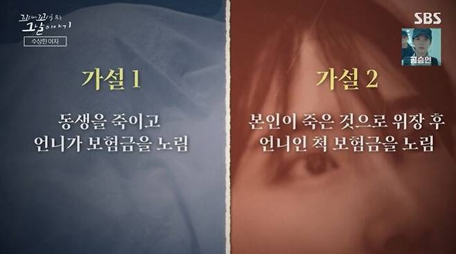 자매니까 목소리가 비슷할 수도 있지. 하지만, 만약에 그게 아니라면? 경우의 수는 두 가지야. 첫번째, 처음부터 언니가 동생인 척 보험계약을 하고, 동생을 사망에 이르게 해 보험금을 타려고 했을 경우. 두번째, 죽었다는 손수정이 사실은 살아있고, 본인이 죽은 것처럼 꾸민 후 언니인 척 보험금을 타려고 했을 경우. 이 두번째 가설에 의하면, 병원에서 손수정이 아닌 다른 누군가가 사망했을 수도 있지. 과연, 어떤 가설이 맞을까?