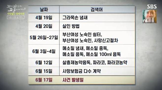 4월 19일 검색어는 '그라목손 냄새'. 그라목손이 뭐냐면, '푸른 악마'라 불리는, 제초제로 사용되는 독성이 높은 농약이야. 이건 왜 검색했을까. 죽이는 방법에 대한 고민이었을까? 그리고 4월 20일에는 '살인방법'. 5월 26일, 27일에는 '부산여성 노숙인 쉼터', '부산여성 노숙인', '사망신고절차'를 검색했어. 살인 방법 뿐만 아니라, 직접적인 대상까지 알아본거야.