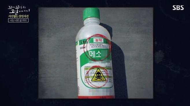 이렇게 남자와 다툰 날이, 바로 7월초야. 손수정이 이유리 씨를 살해했을 거라 추정되는 날짜는 6월 17일. 손수정이 이유리를 데리고 응급실에 간지 약 보름 뒤에, 갑자기 메소밀이 튀어나온 거야. 손수정은 어떻게, 구입한 적도 없다는 메소밀을 갖고 있었을까? 이 메소밀로 이유리 씨를 죽인 걸로 추정이 되지. 형사들은 메소밀을 찾기 위해 뛰어다녔어. 부산에서 농약 파는 가게란 가게는 죄다 뒤지고, 던져버렸다는 메소밀 병을 찾아 헤맸어. 하지만 못 찾았어. 형사들은 너무 답답했대. 심지어 메소밀을 모르고 먹을 수 있을까 의문이 들어서, 살짝 맛까지 봤대.