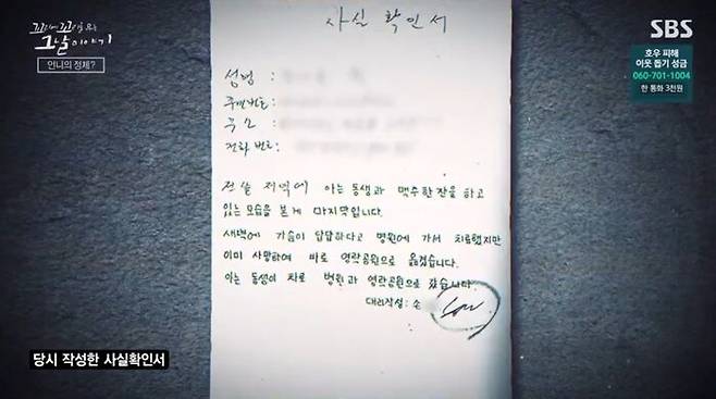박 팀장은 언니한테, 진짜 손수정의 언니가 맞냐고 물으며 신분증을 요구했어. 그랬더니 이 언니라는 사람은, "진짜 언니인지 계속 물어보는 거, 기분이 불쾌하다"며 거부했어. 그래서 박 팀장은 신원 확인을 못했어. 대신 박 팀장은 종이와 펜을 내밀며 수정 씨의 사망경위를 써달라고 했어. 그 순간, 박 팀장의 눈이 날카롭게 빛났어. 이상한 점을 발견했거든.