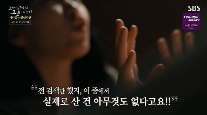 극단적인 선택을 할 생각이었다고 주장하는 손수정에게 배 검사가 "그러면 죽는 방법을 검색해야지, 왜 사람을 죽이는 '살인방법'을 검색한 거냐" 물었어. 살인방법, 사망신고절차, 여성노숙인, 이런 건 자살하고 전혀 상관이 없잖아. 그랬더니 손수정은 이렇게 잡아 떼. "난 검색만 했지, 이 중에서 실제로 산 건 아무것도 없다"라고.