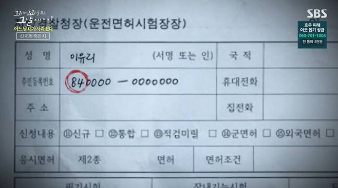 운전면허시험 응시표야. 사진은 손수정이야. 근데 서류에 적힌 이름은, '이유리'고, 주민등록번호도 84년생으로 되어있어. 손수정은 70년생, 40살이었잖아? 이유리는 84년생 26살이야. 나이차가 무려 14살. 이렇게 나이차가 많이 나는데, 이 응시표로 어떻게 운전면허 시험을 본 걸까?