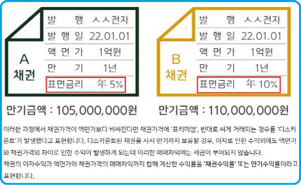 채권의 과세대상소득은 ‘표면이자’와 ‘할인액’이다. ‘할인액’은 만기보장수익률에 따른 원금증가분을 포함하는 개념이다. 예를 들면 만기상환금이 10,000원을 초과하는 경우에는 만기상환금을 ‘원금’으로, 액면가액 10,000원을 ‘발행가액’으로 본다. 할인채의 경우에는 만기에 10,000원을 지급받기에 매입단가는 10,000원보다 적은 금액이다. 할인채의 ‘과세대상소득’은 매입가격과 10,000원과의 차이다. 할인채를 9,500원에 매수했다면 과세대상소득이 500원이 되는 식이다.