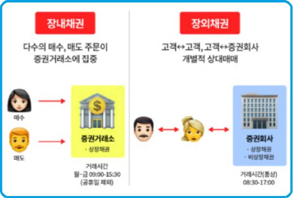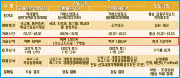 장내시장에서 채권의 거래는 주식거래와 동일한 구조다. 개인투자자들의 HTS, MTS를 통해 채권 장내거래 주문이 가능하다. 매매하려는 종목을 클릭(Click)하면 한국거래소에서 거래되는 매수호가와 매도호가를 확인할 수 있다. 호가수량은 1,000원 단위로 가능하다 액면금액 10,000원어치를 매입할 경우 수량이 10주가 되는 셈이다. 장내에서 채권매매는 ‘당일결제’로 채권과 현금이 교환되는 구조다. 채권 장내거래 수수료는 증권사별로 차이가 있으나 보통은 거래대금의 0.1~0.3% 수준이다. 예를 들면 만기 1년 미만의 채권은 0.1%, 1~2년은 0.2%, 2년 이상은 0.3%의 매매수수료를 적용하는 식이다.