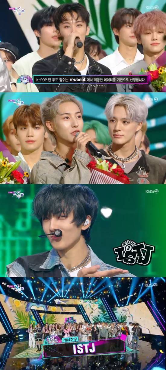 28일 방송된 KBS 2TV '뮤직뱅크'(이하 '뮤뱅') 1174회에서는 그룹 뉴진스의 '슈퍼 샤이'(Super Shy)와 엔시티드림의 '아이에스티제이'(ISTJ)가 7월 넷째 주 1위 후보에 오른 가운데, 엔시티드림이 1위를 차지했다.
