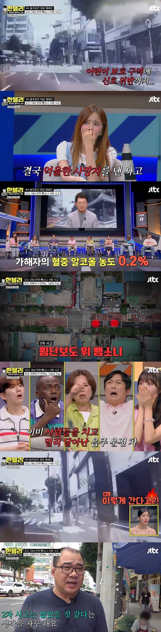 27일 방송된 JTBC '한문철의 블랙박스 리뷰'(이하 '한블리')에서는 게스트로 권은비가 함께한 가운데, 대낮 음주운전으로 횡단보도 위 보행자를 덮치며 총 여섯 명의 사상자를 낸 끔찍한 사고가 소개됐다.