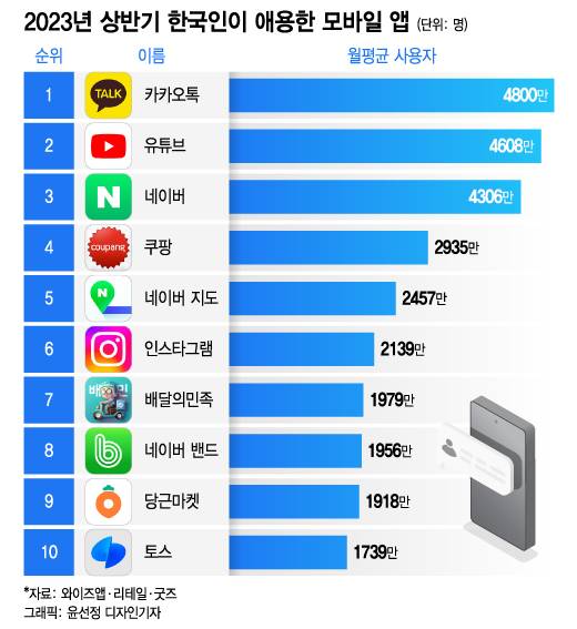 [더차트] 내 최애 앱은 몇 위?…한국인 최다 사용 앱 '톱10' 보니
