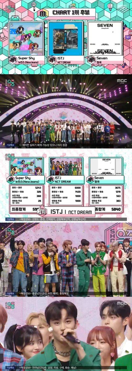 29일 오후 방송된 MBC '쇼! 음악중심'에서는 정국의 'Seven', 뉴진스의 'Super Shy', NCT DREAM의 'ISTJ'가 1위 후보로 맞붙었다.