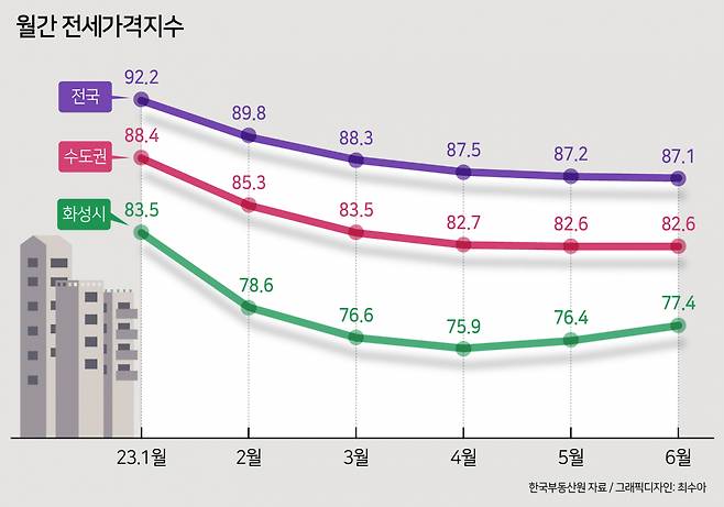 김제경 투미부동산컨설팅 소장은 “화성시를 비롯해 수도권이 전세 가격이 너무 떨어져 더 이상 내려가기 어려워진 시점이 왔다”며 “전세사기 우려 등으로 월세 가격은 계속 오르며 다시 전세로 수요가 돌아올 수 있다”고 말했다. 수도권 월간 아파트 전세가격지수는 지난 2022년 1월부터 하락세로 접어들어 17개월간 하락하다가, 지난달 보합(변동률 0)으로 돌아섰다.