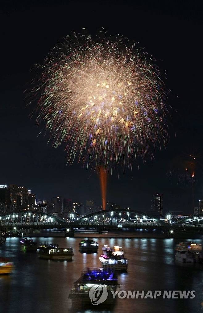 (도쿄 교도=연합뉴스) 일본 도쿄 도심을 남북으로 가로지르는 스미다강에서 지난 29일 화려한 불꽃이 밤하늘을 수놓고 있다. 코로나19로 중단됐다가 4년 만에 다시 열린 스미다강 불꽃놀이에는 100만 명 넘는 사람이 몰렸다. 2023.7.30