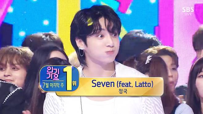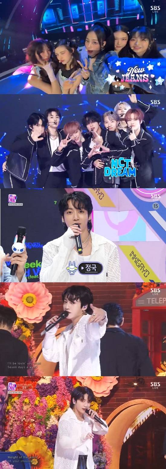30일 방송한 SBS 음악 프로그램 '인기가요'에서는 방탄소년단(BTS) 정국의 솔로곡 'Seven(세븐)'과 NCT DREAM(엔시티 드림)의 'ISTJ', 뉴진스(NewJeans)의 'Super Shy'가 7월 마지막 주 1위 후보로 올랐다.
