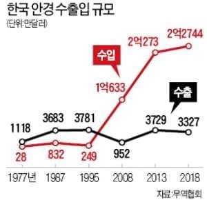 1990년대까지 안경은 한국의 대표적 수출 상품 중 하나였다. 1995년 기준 한국은 3781만달러를 수출하던 세계 2위 안경 수출 대국이었다. 당시 249만달러에 불과하던 안경 수입액은 2018년 기준으로 100배 가까이 커진 2억3000만달러에 육박할 정도가 됐지만, 수출액은 오히려 10% 줄어든 3327만달러 수준에 머물고 있다. 한마디로 메이저리그에서 강등된 마이너리그 선수 신세가 된 것이다.