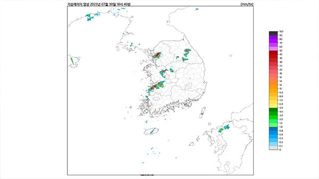 오늘(30일) 저녁 6시 45분 현재, 서울 영등포구 당산동에 직전 1시간 동안 71.5mm의 매우 강한 비가 내렸습니다.