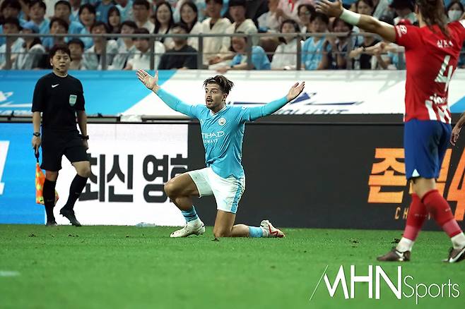 (MHN스포츠 박태성 기자) 30일 서울 마포구 상암동 서울월드컵경기장에서 열린 쿠팡시리즈 2차전 맨체스터 시티와 AT.마드리드 경기가 열린 가운데, 맨시티 잭 그릴리쉬가 반칙을 당하며 심판에게 어필을 하고 있다.