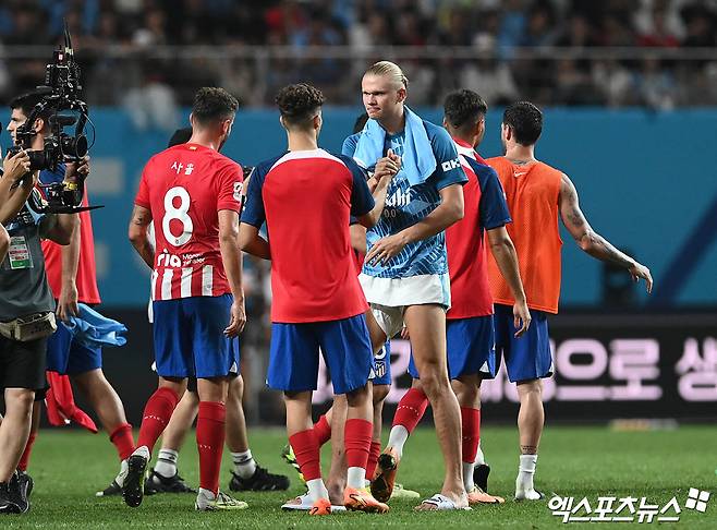경기 종료 후 맨시티 엘링 홀란이 AT 마드리드 선수들과 인사를 나누고 있다.