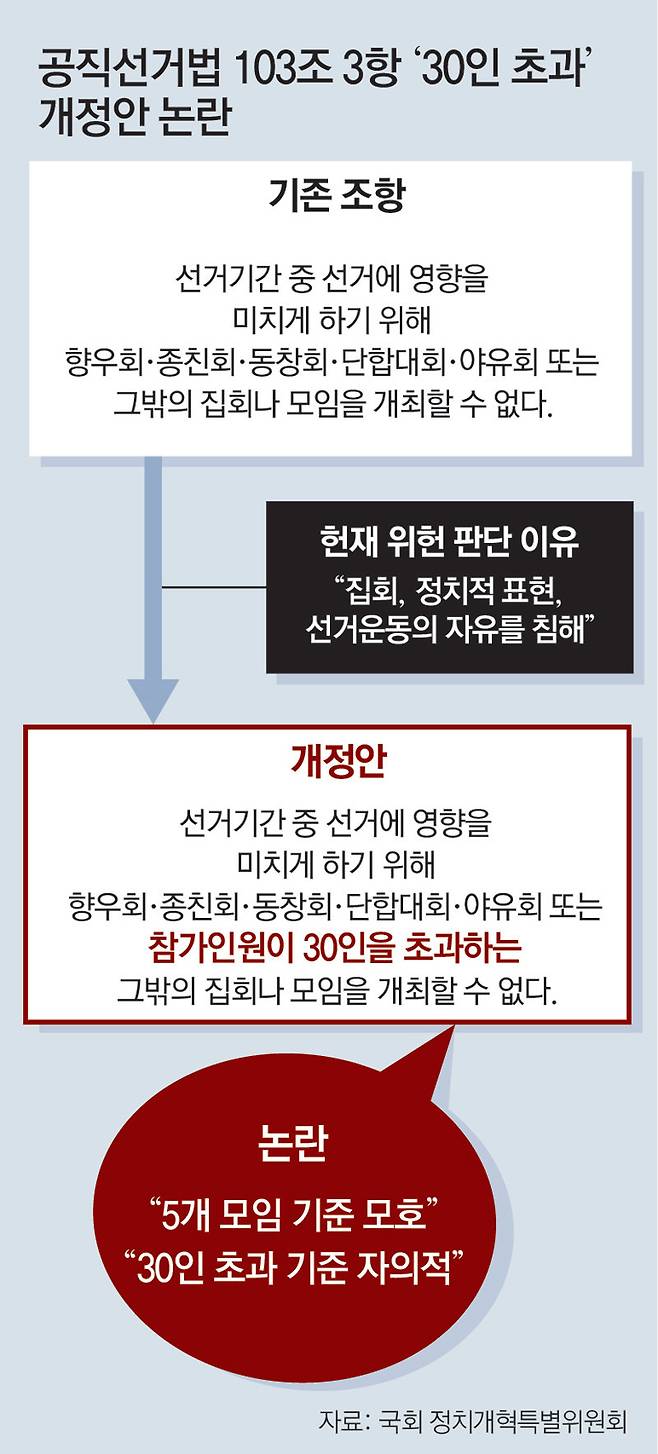 국민의힘 관계자는 “동창회는 안 되고 동문회는 된다는 것인지, 전우회는 가능하다는 것인지 5개 단체 기준이 모호하다”고 지적했다. 선관위도 정개특위 논의 과정에서 “선거에 영향을 미치는 모임이 무엇인지 구별하기는 쉽지 않을 것”이라는 우려를 나타내기도 했다. 여당 소속의 한 법사위원은 “30명 기준이 왜 생긴 건지 설명도 안 되고, 30명은 선관위가 관리하기도 어렵다”고 말했다.