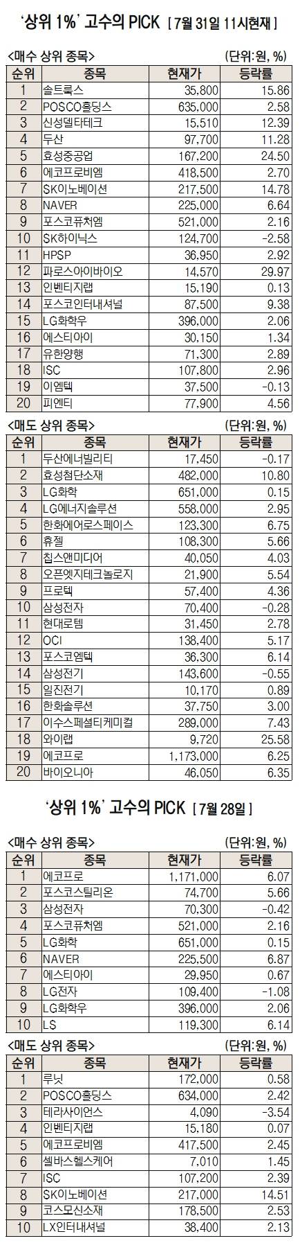미래에셋증권은 자사 고객 중에서 지난 1개월간 수익률 상위 1% 투자자들의 매매 종목을 집계해 실시간·전일·최근 5일 기준으로 모바일트레이딩시스템(MTS)상에서 공개하고 있다. 이 통계 데이터는 미래에셋증권의 의견과 무관한 단순 정보 안내이며, 각각의 투자자 개인에게 맞는 투자 또는 수익 달성을 보장하지 않는다. 또 테마주 관련종목은 이상 급등락 가능성이 있으므로 유의해야 한다.